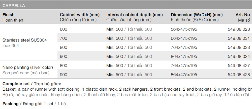 Đặc tính rổ xoong nồi Hafele 549.08.023 Cappella R600mm inox